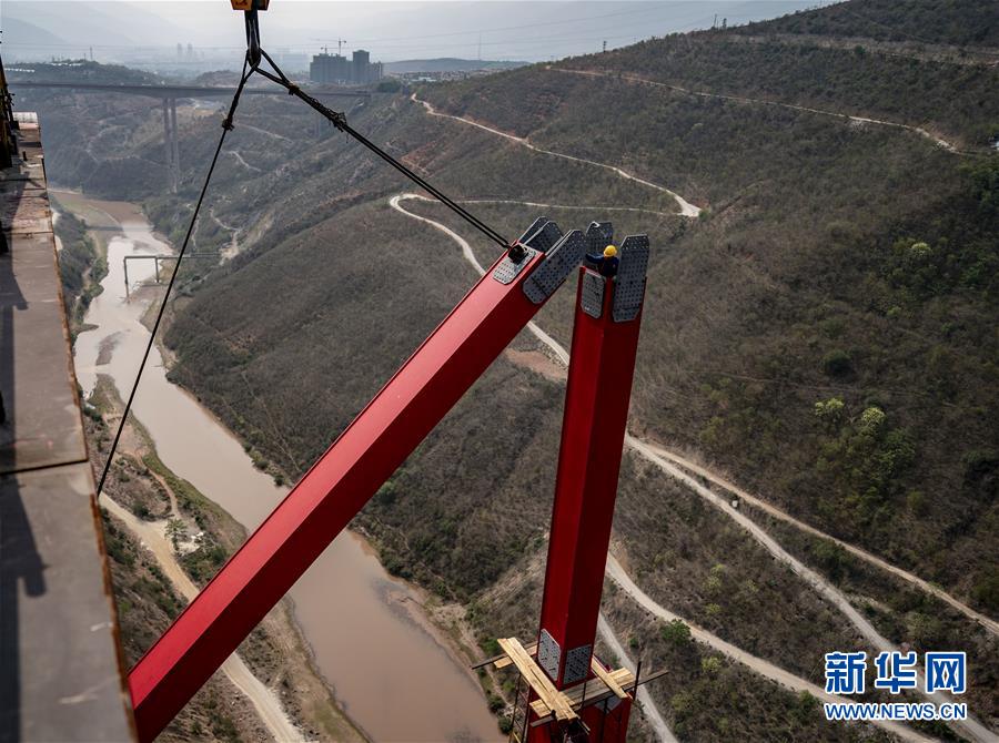 4月8日,來自湖北鄂州的中鐵四局工人熊學(xué)良進(jìn)行鋼桁梁架設(shè)作業(yè)。新華社記者江文耀攝