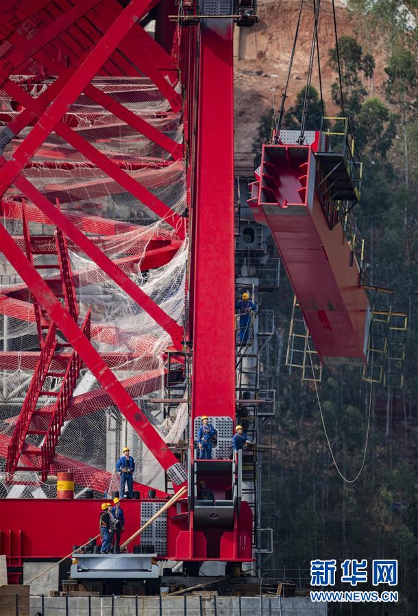 4月8日,中鐵四局的工人們進(jìn)行鋼桁梁架設(shè)作業(yè)。新華社記者江文耀攝