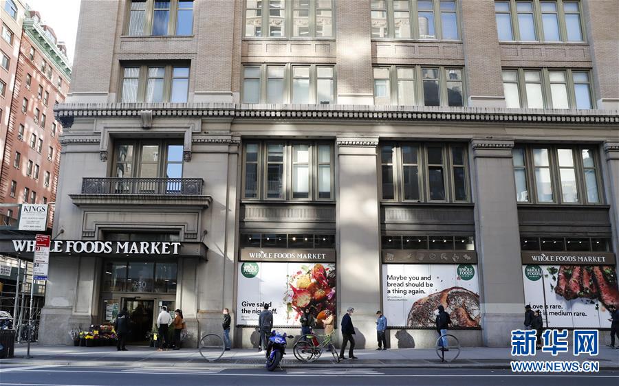 3月21日,在美國紐約,人們排隊(duì)時(shí)保持距離,準(zhǔn)備進(jìn)入一家超市購物。新華社記者王迎攝