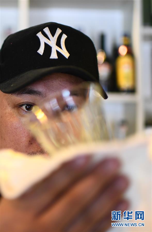 4月10日,才仁俄賽在餐廳中擦拭酒杯。新華社記者張宏祥攝