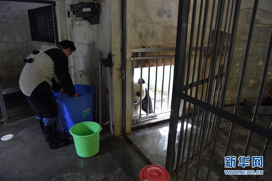 4月14日,中國(guó)大熊貓保護(hù)研究中心核桃坪基地飼養(yǎng)員周季秋在大熊貓“喜妹”的圈舍內(nèi)打掃衛(wèi)生。新華社記者張超群攝