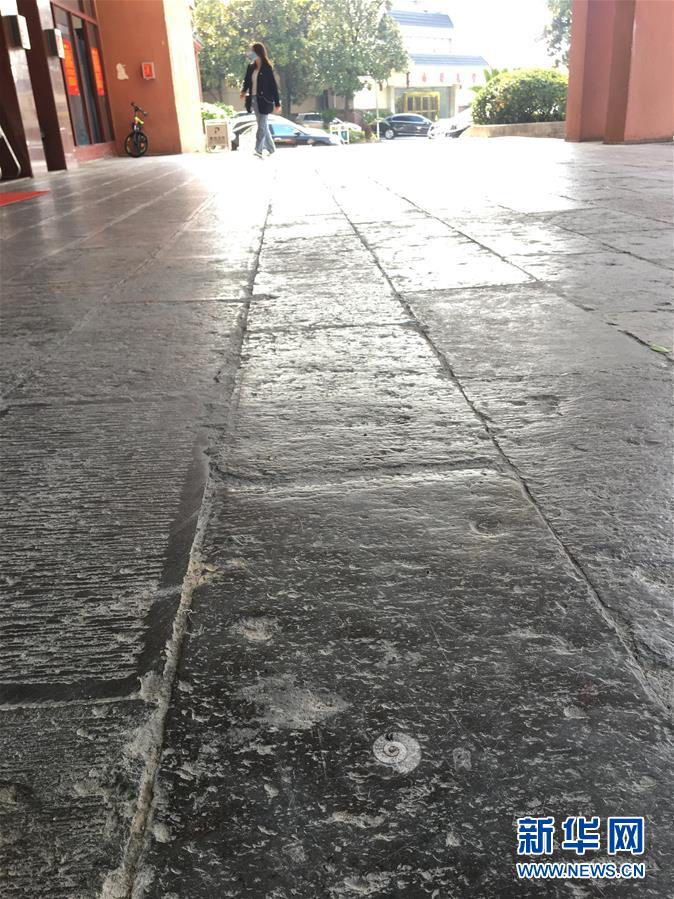 這是4月9日在張家界市區(qū)一路面拍攝的遠(yuǎn)古海洋生物化石地板。新華社記者蘇曉洲攝