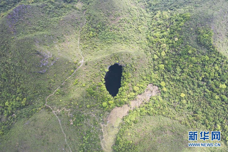這是4月19日拍攝的中國(guó)樂業(yè)—鳳山世界地質(zhì)公園內(nèi)的天坑(無人機(jī)照片)。新華社記者曹祎銘攝