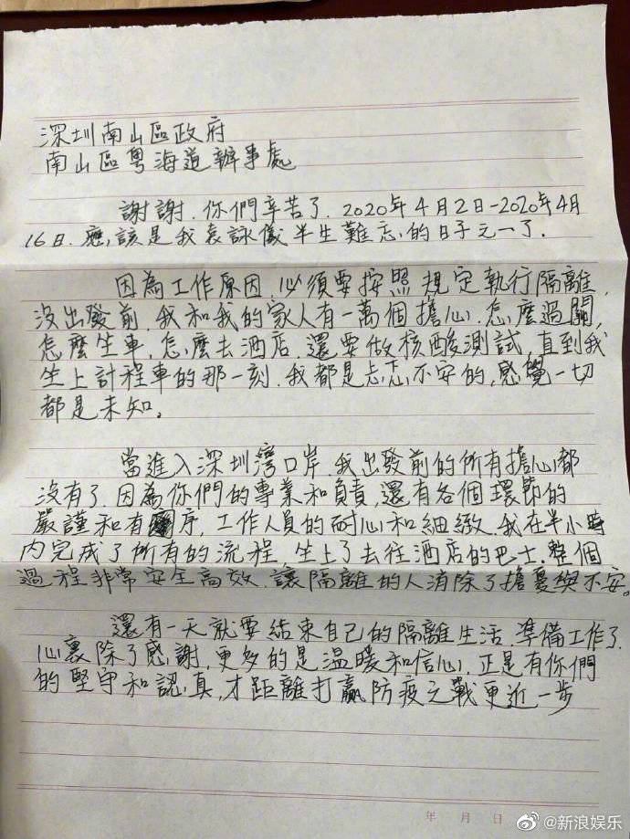 記者了解到,4月2日,袁詠儀因?yàn)楣ぷ髟?,從香港?lái)到深圳,按規(guī)定要到酒店隔離至16日。這段隔離的日子,她表示這是“半生中難忘的日子之一”了。4月15日,她即將結(jié)束隔離,為對(duì)這期間辛苦的工作人員表示感謝,她寫了一封信向南山區(qū)政府和“網(wǎng)紅街道”粵海街道辦事處致謝,回憶了當(dāng)時(shí)在深圳灣口岸半小時(shí)就完成所有流程、前往酒店隔離的過(guò)程,點(diǎn)贊了深圳政府一系列安全高效的隔離措施。