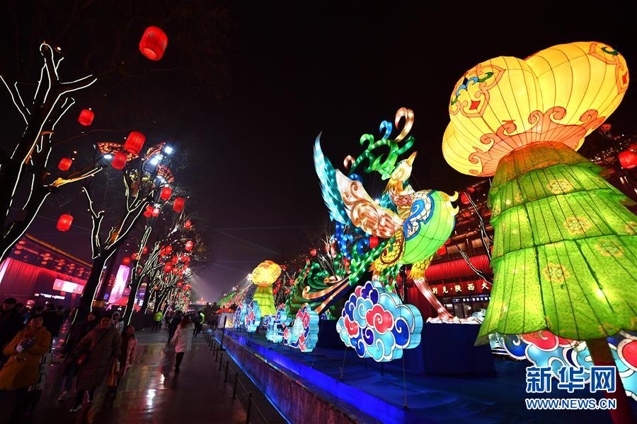 1月17日,游客在西安大唐不夜城步行街欣賞彩燈。大唐不夜城步行街位于西安市大雁塔腳下,近年來,步行街突出歷史文化特色,以唐代元素為主線,創(chuàng)新打造文化濃厚的現(xiàn)代時尚街區(qū),已成為西安旅游新地標(biāo)。 新華社記者 張博文 攝