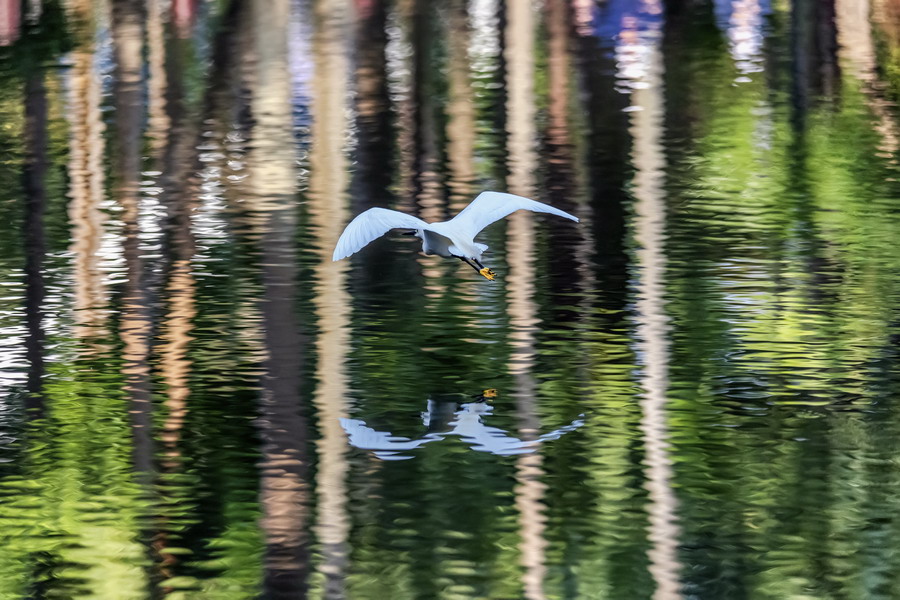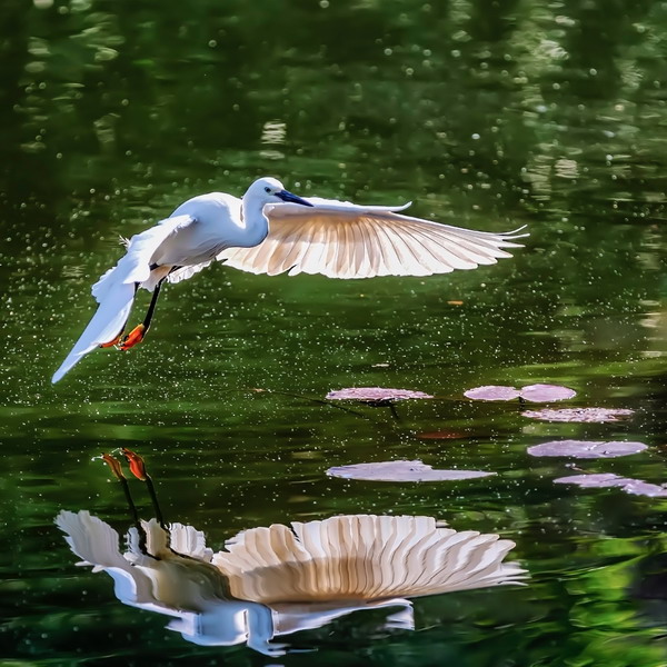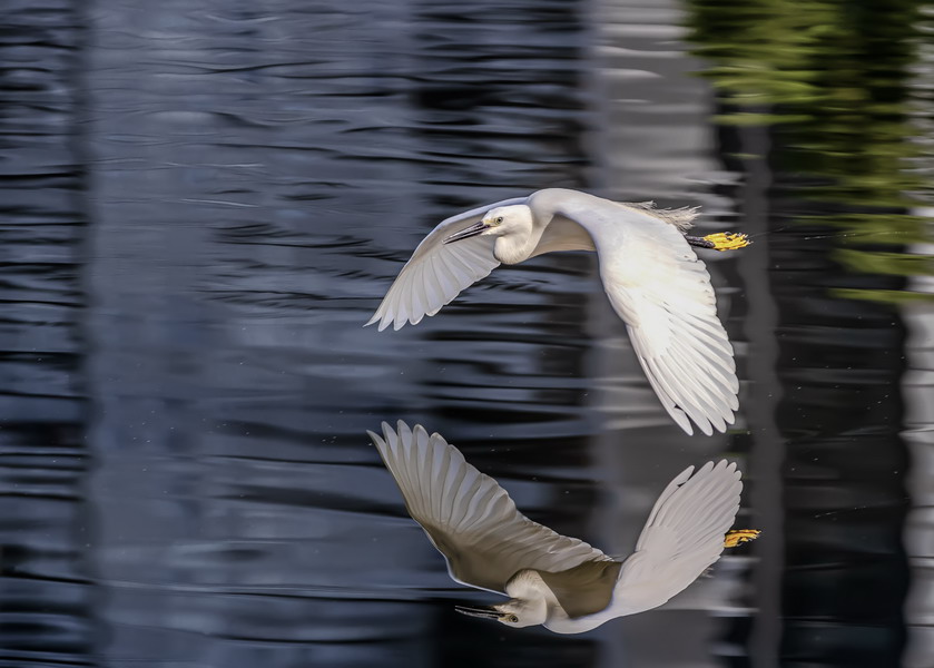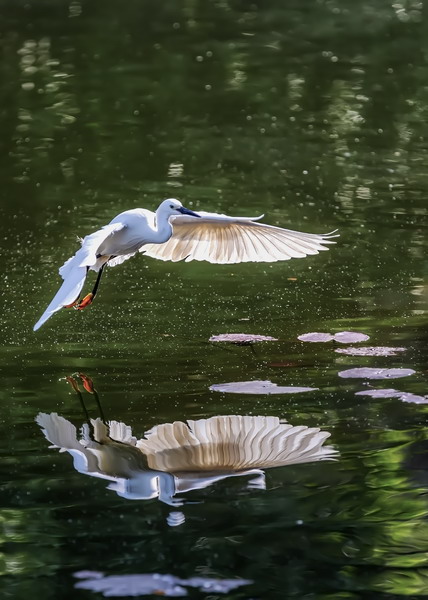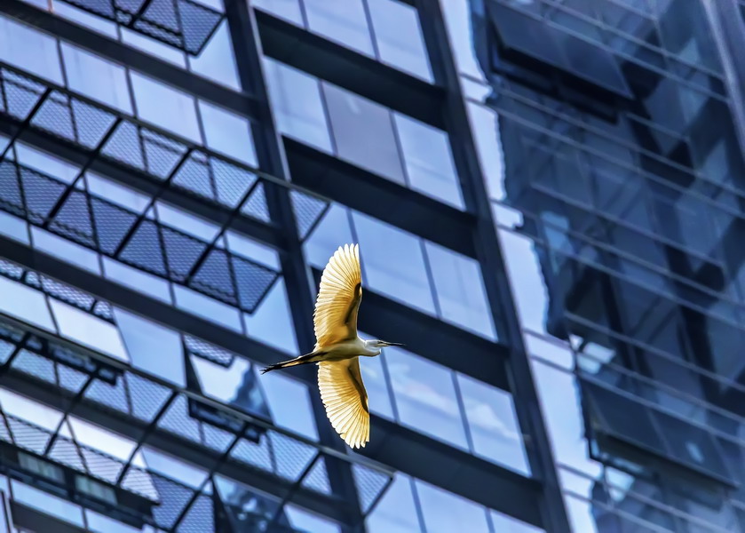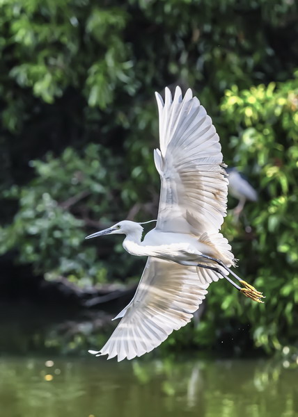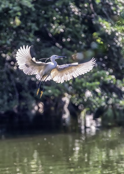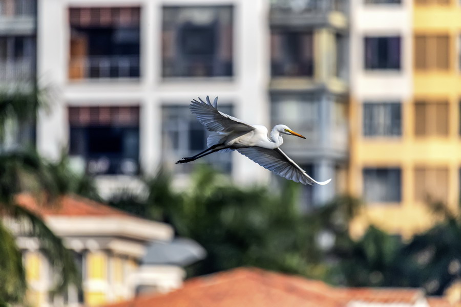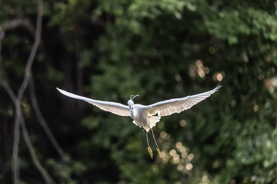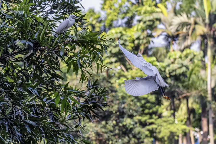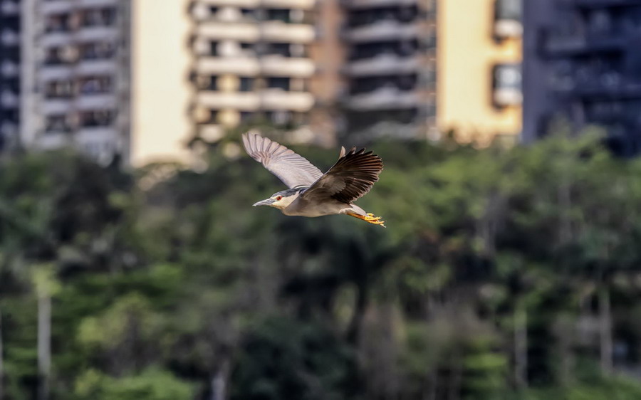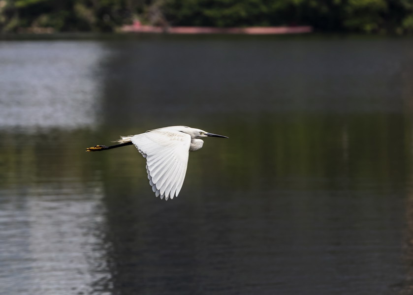 4月15日,攝于南山區(qū)華僑城天鵝堡附近。這是深圳拍鷺鳥的其中一個好去處。白鷺飛行時頭往回縮至肩背處,頸向下曲成袋狀,兩腳向后伸直,遠(yuǎn)遠(yuǎn)突出于尾后,兩翅緩慢地鼓動飛翔。徐捷攝