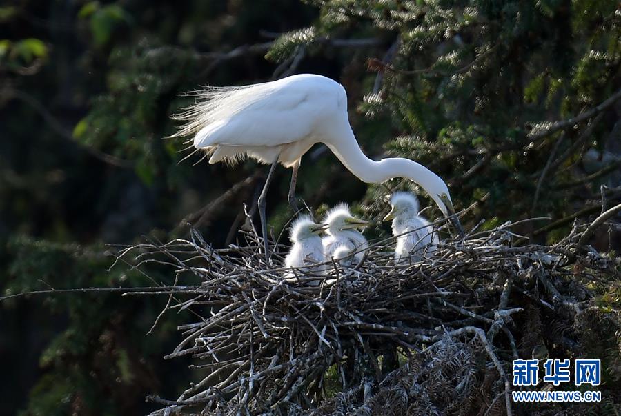 在象山森林公園,白鷺和幼鳥在一起(4月26日攝)。近日,在江西省南昌市新建區(qū)象山森林公園內(nèi),已安家筑巢的大批鷺鳥正陸續(xù)孵化后代,一派生機(jī)勃勃的景象。新華社記者彭昭之?dāng)z
