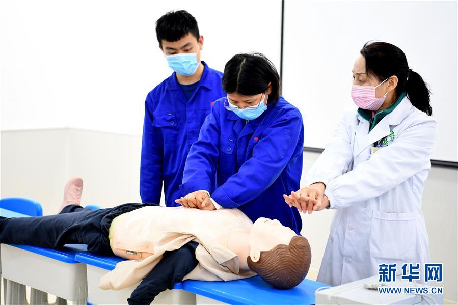 4月27日,常青街道竹西社區(qū)邀請醫(yī)護人員(右一)為轄區(qū)企業(yè)工人講解急救知識。當日,安徽省合肥市包河區(qū)常青街道開展健康講座、職業(yè)病防護宣傳等系列活動,提高勞動者的自我防護意識和能力,迎接“五一”國際勞動節(jié)。新華社記者劉軍喜攝