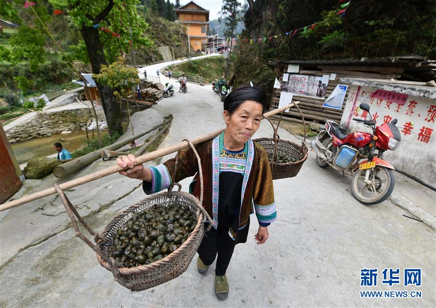 3月25日,在桂黔烏英苗寨,村民將螺苗挑往稻田,準(zhǔn)備投放。新華社記者黃孝邦攝