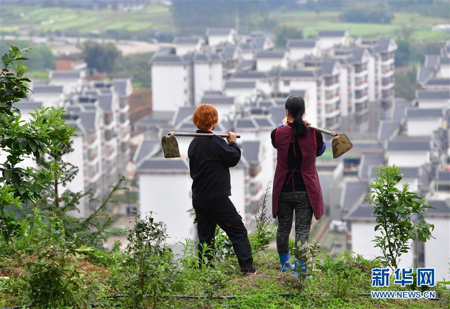 在廣西融水苗族自治縣縣城一處易地扶貧搬遷小區(qū)附近,45歲的楊美燕(左)和搬遷戶楊鮮花在農(nóng)場里護理果樹(3月13日攝)。