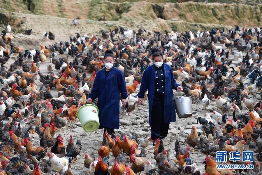 在廣西融水苗族自治縣香粉鄉(xiāng)香粉村,34歲的吳春穎(右)和妹妹吳冬仙在養(yǎng)殖場里喂雞(3月14日攝)。