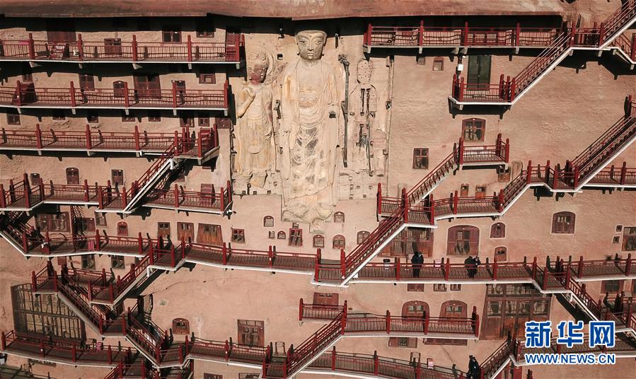 12月26日,游客在麥積山石窟參觀游覽(無人機拍攝)。新華社記者馬寧攝