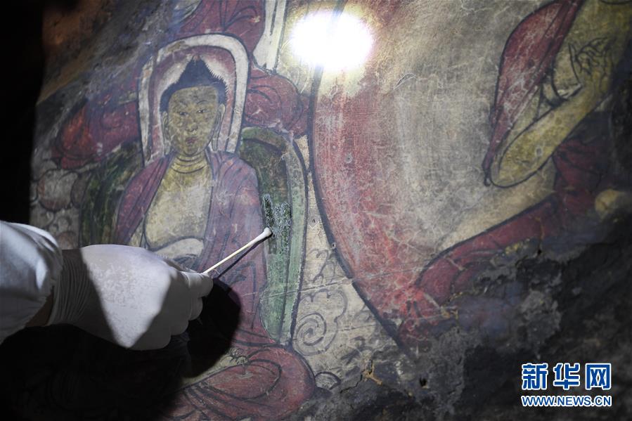 4月27日,文物修復(fù)專家在寧夏須彌山石窟圓光寺48號窟內(nèi)修復(fù)壁畫。新華社記者王鵬攝