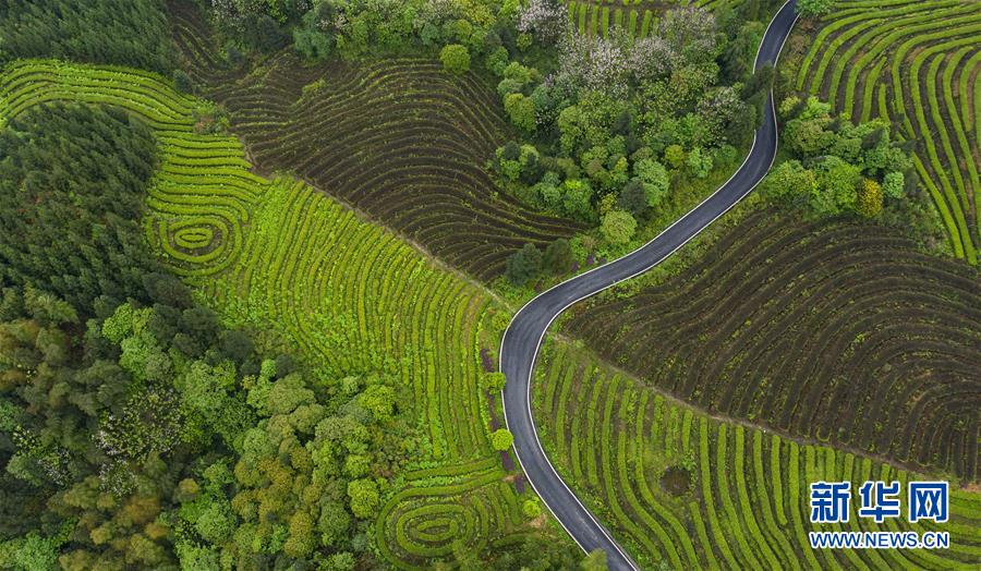 俯瞰鹿鳴茶海一角(4月28日無人機照片)。四川省珙縣的鹿鳴茶海,常年云霧繚繞,茶壟依山分布,美不勝收。新華社記者江宏景攝