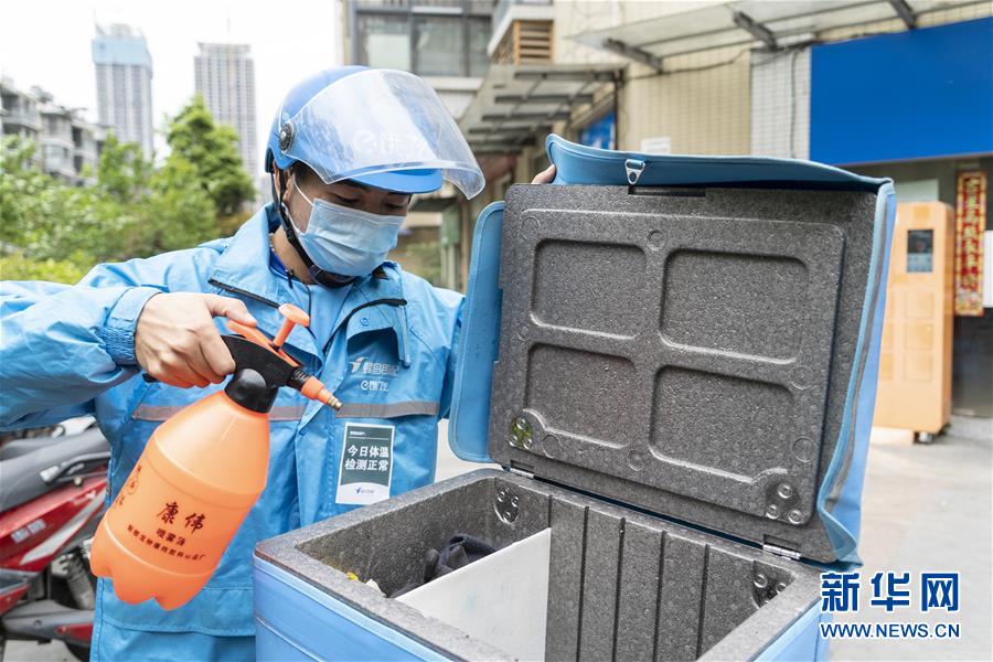 4月22日,在四川省成都市的一家外賣配送站點(diǎn),邱有哈子在給餐箱消毒。新華社記者 李夢(mèng)馨 攝