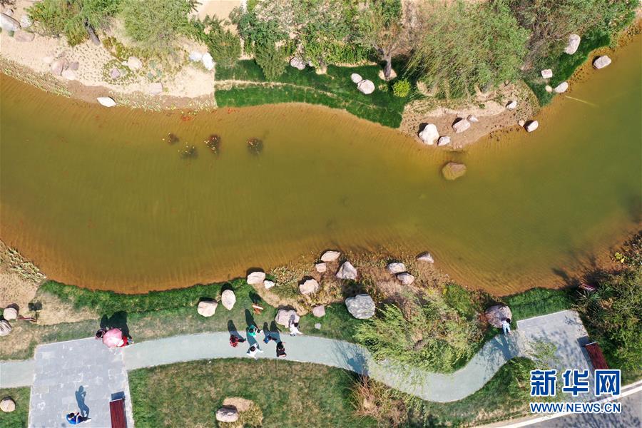 5月1日,游客在河南省鶴壁市淇濱區(qū)鉅橋鎮(zhèn)崗坡村的水系旁游玩(無人機照片)。 新華社記者馮大鵬攝
