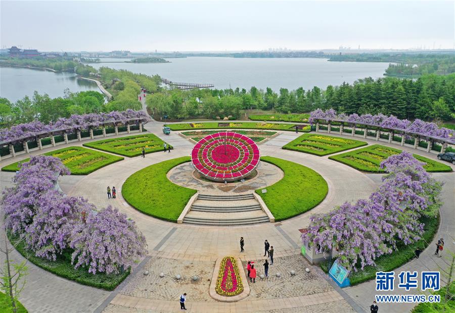 5月2日,游人在位于山東青島膠州市的青島大沽河省級生態(tài)旅游度假區(qū)賞花游玩(無人機(jī)照片)?!拔逡弧奔偃掌陂g,人們以多種方式放松心情、享受假日。新華社發(fā)(王昭脈攝)