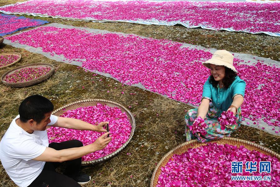 5月1日,游客在重慶市黔江區(qū)沙壩鎮(zhèn)天香玫瑰莊園體驗(yàn)晾曬玫瑰花瓣?!拔逡弧奔偃掌陂g,人們以多種方式放松心情、享受假日。新華社發(fā)(楊敏攝)
