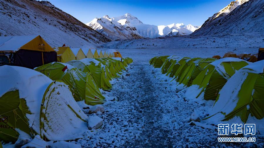 珠峰大本營(yíng)的清晨,隊(duì)員睡覺(jué)的帳篷上覆蓋著積雪(5月3日攝)。新華社記者普布扎西攝