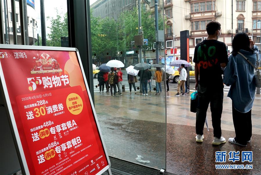 上海淮海路一家商場布置的“五五購物節(jié)”活動信息(5月5日攝)。5月4日晚,上海首次啟動大規(guī)模商業(yè)促銷活動“五五購物節(jié)”,多家在線新經(jīng)濟企業(yè)參與,通過線上流量優(yōu)勢反哺線下賣場,實現(xiàn)電商與實體零售融合互動,激活消費潛力、驅(qū)動消費復(fù)蘇。據(jù)“上海發(fā)布”的消息,截至5日14時12分,“五五購物節(jié)”上海地區(qū)消費支付總額已超100億元。新華社記者劉穎攝