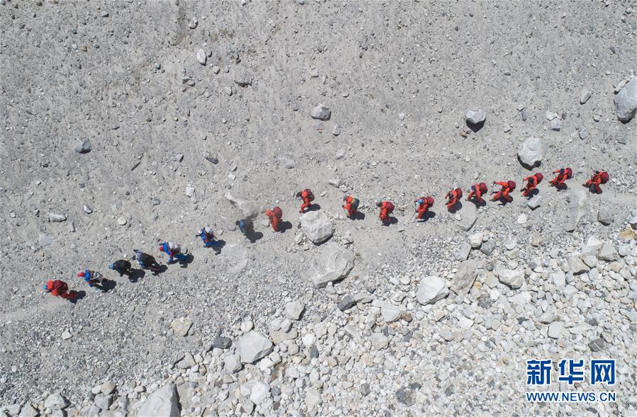 5月6日,登山隊員們向更高海拔進(jìn)發(fā)(無人機(jī)照片)。新華社記者晉美多吉攝