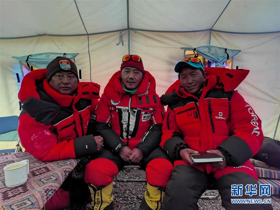 5月7日,在海拔6500米的珠峰前進營地,測量登山隊隊長次洛(中)與旺青索朗(左)、魯達(右)在協(xié)調(diào)會議現(xiàn)場。新華社特約記者扎西次仁攝