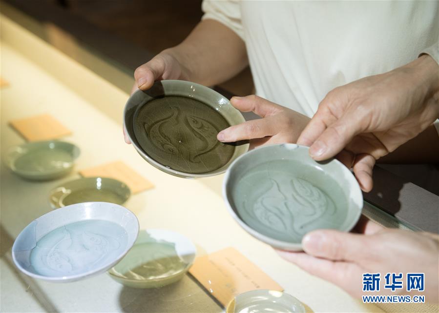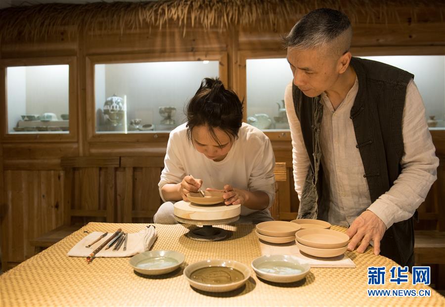 5月8日,“90后”瓷人湯佳(左)在龍泉青瓷裝飾紋樣研究所對(duì)著項(xiàng)宏金收藏的古瓷器刻劃魚(yú)紋盤(pán)。1965年出生的項(xiàng)宏金,被浙江龍泉年輕一代瓷人稱為“項(xiàng)哥”,他從20世紀(jì)90年代開(kāi)始收集龍泉青瓷標(biāo)本,研究青瓷紋樣。2014年出版著作《龍泉青瓷裝飾紋樣》,次年開(kāi)設(shè)龍泉青瓷裝飾紋樣研究所,將自己收藏的千余件標(biāo)本跟瓷器愛(ài)好者、創(chuàng)作者免費(fèi)分享。新華社記者翁忻旸攝