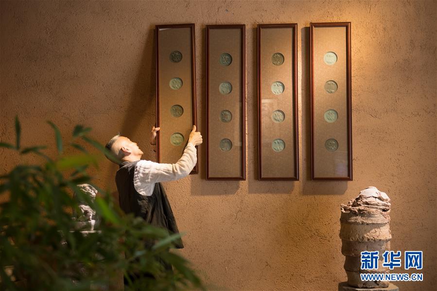 5月7日,項(xiàng)宏金在龍泉青瓷裝飾紋樣研究所懸掛用古青瓷標(biāo)本制作的掛框。1965年出生的項(xiàng)宏金,被浙江龍泉年輕一代瓷人稱為“項(xiàng)哥”,他從20世紀(jì)90年代開(kāi)始收集龍泉青瓷標(biāo)本,研究青瓷紋樣。2014年出版著作《龍泉青瓷裝飾紋樣》,次年開(kāi)設(shè)龍泉青瓷裝飾紋樣研究所,將自己收藏的千余件標(biāo)本跟瓷器愛(ài)好者、創(chuàng)作者免費(fèi)分享。新華社記者翁忻旸攝