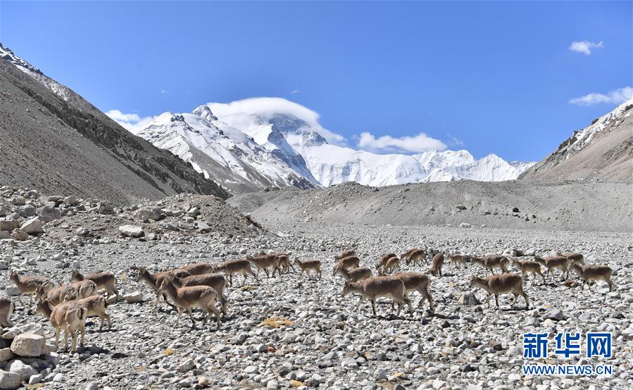 一群巖羊在珠峰大本營附近覓食(5月8日攝)。當(dāng)日,一群巖羊在珠峰大本營周圍覓食,黃嘴山鴉飛到巖羊身上停留,構(gòu)成一幅幅生動有趣的雪域圖畫。新華社記者晉美多吉攝