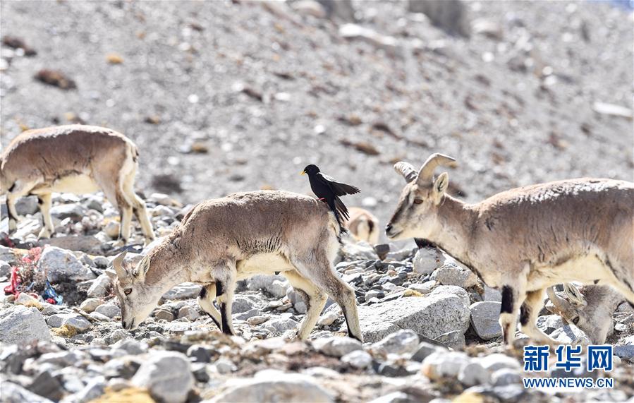黃嘴山鴉停留在巖羊身上(5月8日攝)。當(dāng)日,一群巖羊在珠峰大本營周圍覓食,黃嘴山鴉飛到巖羊身上停留,構(gòu)成一幅幅生動有趣的雪域圖畫。新華社記者晉美多吉攝