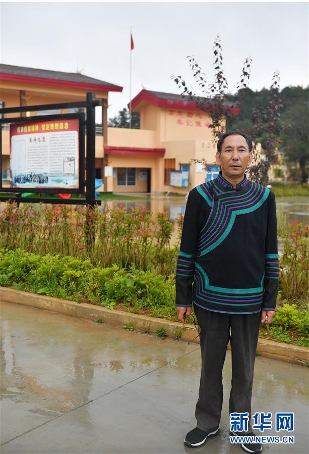 彝海結(jié)盟紀(jì)念館管理員沙馬依姑在彝海村前留影(2019年9月7日攝)。新華社記者孫瑞博攝