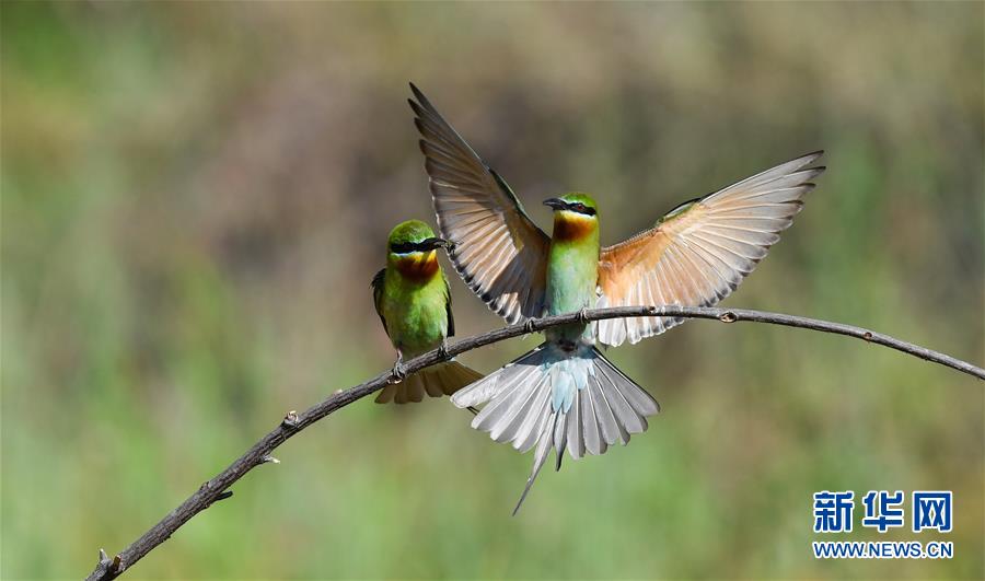 在??谖逶春酉掠畏浠⒈Wo小區(qū),栗喉蜂虎在樹枝上休息(5月7日攝)。