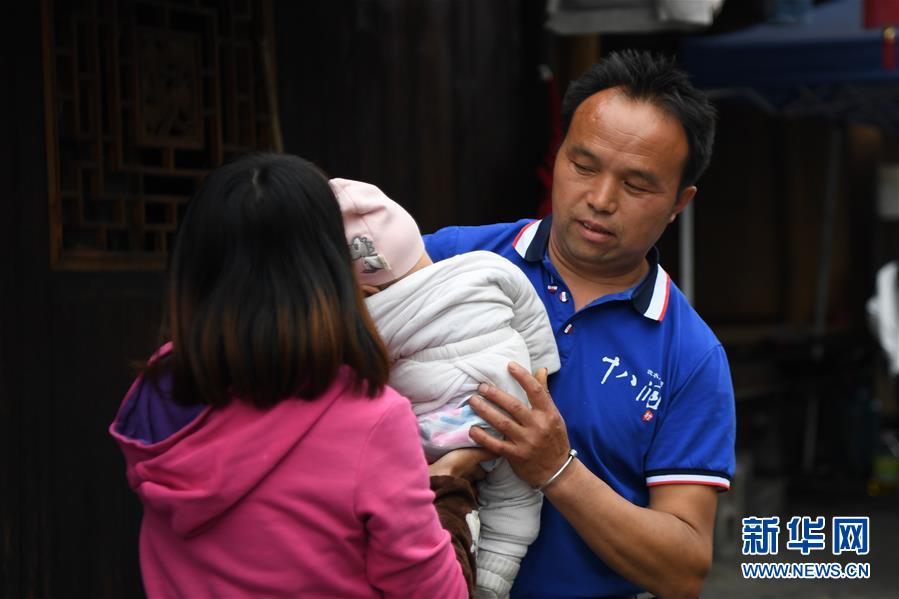 施六金(右)從妻子手中接過兒子施澤恩(4月25日攝)。1973年出生于十八洞村的施六金,由于父親患病很早就放棄學(xué)業(yè)和母親扛起了家庭的重?fù)?dān)。為了生活,他還曾遠(yuǎn)去東南亞打工。2015年,看到家鄉(xiāng)的變化,施六金回到村里開起了農(nóng)家樂,年度家庭人均純收入也從2014年的1715元增長到了2019年的35696元。2018年,施六金與心愛的人組建了家庭。今年初,施六金與愛人迎來了一個(gè)大胖小子。“做人做事要懂得回報(bào)和感恩?!笔┝鸾o剛出生的兒子取名施澤恩。新華社記者薛宇舸攝