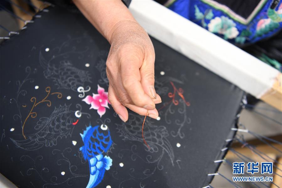 吳美金在十八洞村苗繡特產(chǎn)農(nóng)民專業(yè)合作社繡苗繡(4月24日攝)。1967年出生的吳美金,1992年嫁入飛蟲村(現(xiàn)十八洞村飛蟲寨)時(shí),只有爛泥路的飛蟲村不僅田土少,掙錢活路也少,生活十分困難。2014年,吳美金加入了十八洞村苗繡特產(chǎn)農(nóng)民專業(yè)合作社,從小就會的苗繡傳統(tǒng)手藝如今成了家庭增收的法寶,不僅在家門口就把錢掙了,同時(shí)還能照顧年幼的孫子孫女?!艾F(xiàn)在的日子,比年輕的時(shí)候好多了?!眳敲澜鹫f。新華社記者薛宇舸攝