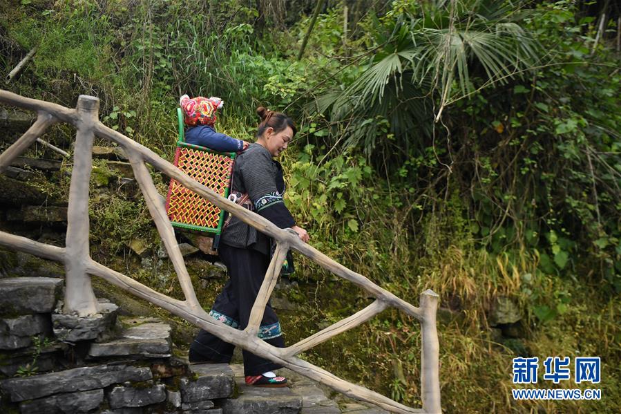 吳美金背著孫子走在十八洞村中,準(zhǔn)備前往村里的苗繡合作社(4月24日攝)。1967年出生的吳美金,1992年嫁入飛蟲村(現(xiàn)十八洞村飛蟲寨)時(shí),只有爛泥路的飛蟲村不僅田土少,掙錢活路也少,生活十分困難。2014年,吳美金加入了十八洞村苗繡特產(chǎn)農(nóng)民專業(yè)合作社,從小就會的苗繡傳統(tǒng)手藝如今成了家庭增收的法寶,不僅在家門口就把錢掙了,同時(shí)還能照顧年幼的孫子孫女?!艾F(xiàn)在的日子,比年輕的時(shí)候好多了?!眳敲澜鹫f。新華社記者薛宇舸攝