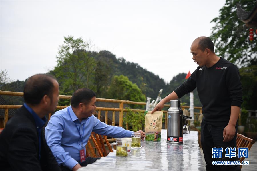 楊正邦(右)在為來自浙江的住客介紹十八洞村種植的“黃金茶”(4月25日攝)。楊正邦1978年出生于十八洞村,在外打工多年。近些年,眼看來十八洞村的游客越來越多,村里越來越熱鬧,楊正邦在2017年結束自己的打工生涯回鄉(xiāng)發(fā)展。他先是在村里擺起小吃攤,2018年開起農(nóng)家樂,去年又搭起新房子擴建成民宿,年度家庭人均純收入從2014年的1923元增加到2019年的7173元。新華社記者薛宇舸攝