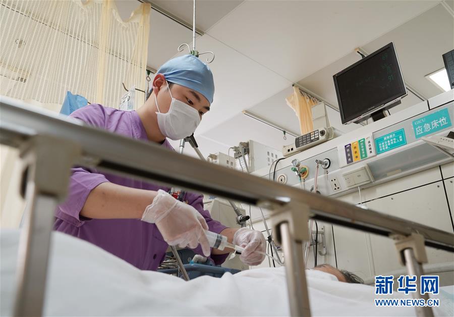 5月10日,在上海市普陀區(qū)中心醫(yī)院急診重癥監(jiān)護室內(nèi),23歲的護士范磊磊為患者進行鼻飼。男護士團隊中的絕大多數(shù)護士是“90后”。