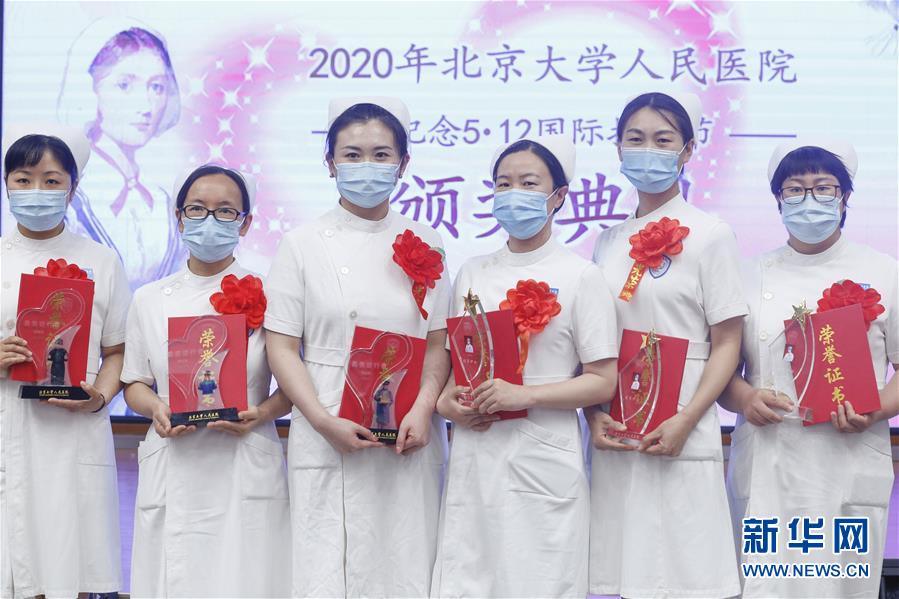 5月11日,獲獎(jiǎng)護(hù)士在護(hù)士節(jié)活動(dòng)上合影。在國(guó)際護(hù)士節(jié)到來(lái)之際,北京大學(xué)人民醫(yī)院11日舉辦慶祝護(hù)士節(jié)暨優(yōu)秀集體和個(gè)人表彰活動(dòng),并邀請(qǐng)?jiān)踽t(yī)療隊(duì)護(hù)士代表分享戰(zhàn)“疫”故事。我國(guó)今年護(hù)士節(jié)的主題為“致敬護(hù)士隊(duì)伍,攜手戰(zhàn)勝疫情”。新華社記者張玉薇攝