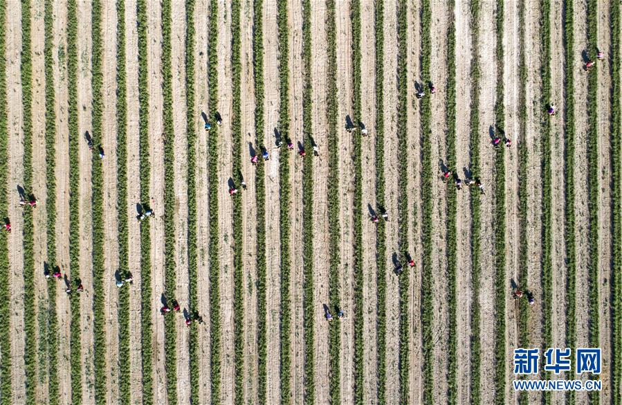 5月11日,采茶工在寧夏百瑞源賀蘭山基地采摘枸杞芽茶(無(wú)人機(jī)照片)。當(dāng)日,寧夏百瑞源賀蘭山基地枸杞芽茶全面進(jìn)入采摘季。據(jù)了解,該基地茶園面積300余畝,助力附近200多名農(nóng)民就業(yè)增收。新華社記者楊植森攝