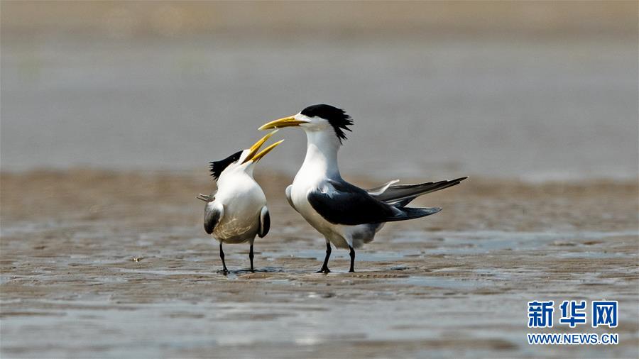 眼下正是大鳳頭燕鷗繁育的時節(jié),在福建閩江河口濕地核心區(qū)鱔魚灘的沙洲上,大鳳頭燕鷗正相互嬉戲(5月9日攝)。新華社記者梅永存攝