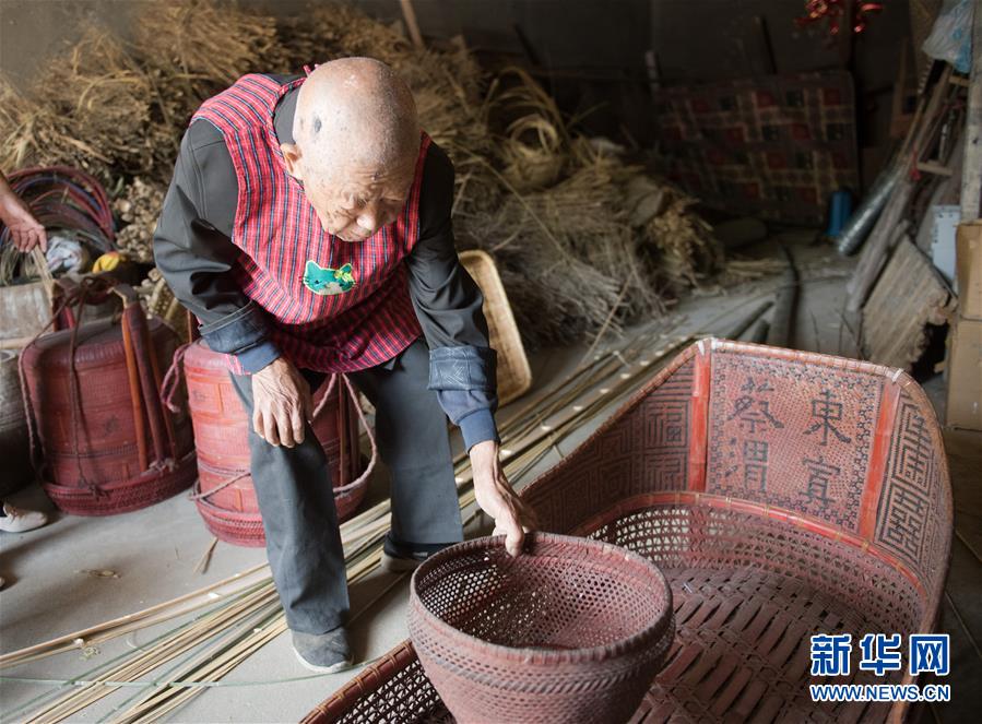 5月12日,浙江諸暨龍溪村的百歲老人蔡渭東在家中展示自己早年做的農(nóng)村婚事用的篾器。浙江諸暨東和鄉(xiāng)龍溪村有一位102歲的老人蔡渭東,他從12歲開始拜師學藝,做了90年的篾匠,如今依然耳聰目明,每天堅持編織篾器。蔡渭東老人說他舍不得丟掉這份老手藝,也希望年輕人能傳承下去。新華社記者翁忻旸攝