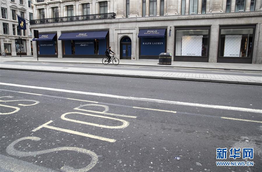 5月12日,英國倫敦主要商業(yè)街之一的攝政街上的店鋪全部關(guān)閉。新華社記者韓巖攝