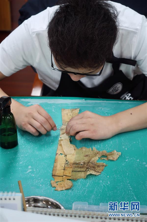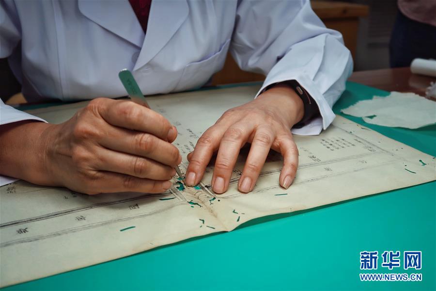 5月13日,天一閣藏品修復(fù)部主任王金玉在對(duì)書頁進(jìn)行修復(fù)。天一閣藏品修復(fù)部目前有修復(fù)師14人,每年約修復(fù)古籍14000余頁。據(jù)介紹,修復(fù)一冊古籍通常需要1至2個(gè)月,有的甚至需要1年以上。新華社記者鄭夢雨攝