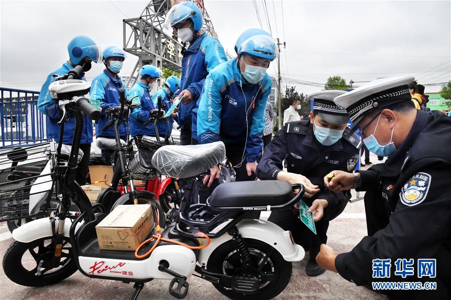 5月14日,青島市李滄交警部門(mén)民警為一外賣企業(yè)員工集中辦理電動(dòng)自行車掛牌。新華社記者李紫恒攝