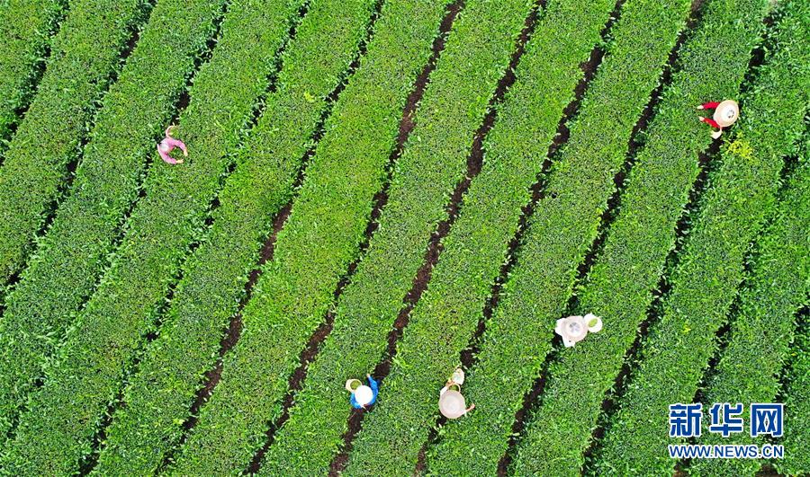 5月17日,村民在新院村茶葉基地采摘夏茶(無人機照片)。新華社記者王全超攝