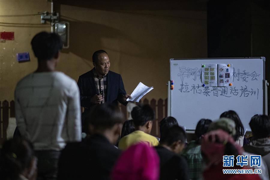 村民們利用夜間空閑時間,在院子里集體學(xué)習(xí)普通話(3月28日攝)。新華社記者江文耀攝