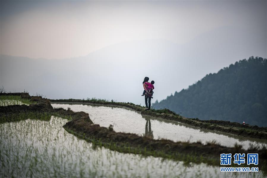 一名婦女背著孩子準(zhǔn)備去田里勞作(3月26日攝)。新華社記者江文耀攝