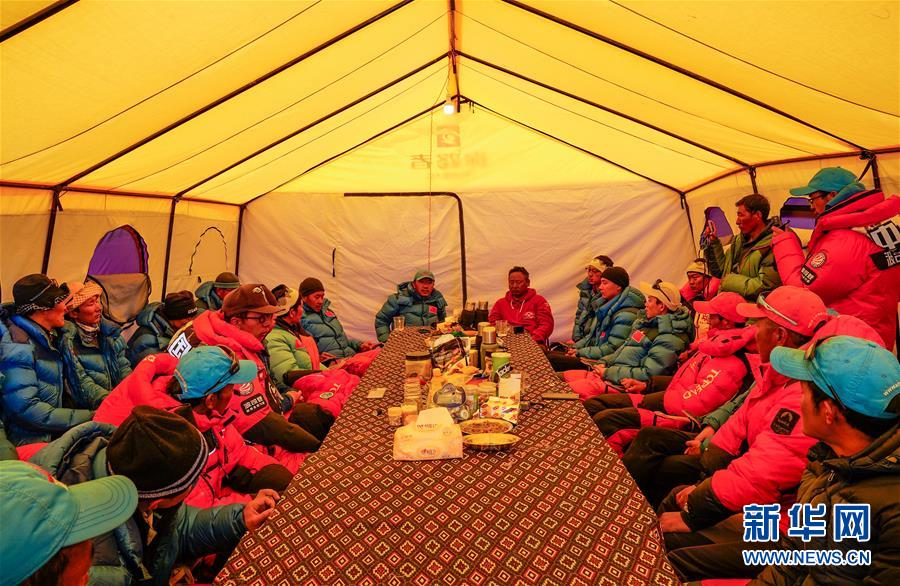 這是在海拔6500米的珠峰前進(jìn)營地拍攝的公布2020珠峰高程測量12人沖頂隊(duì)員名單現(xiàn)場(5月18日攝)。新華社特約記者扎西次仁攝