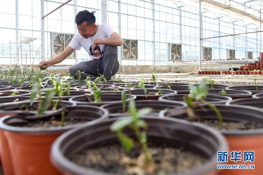 在吉木薩爾縣七彩蝶園,關(guān)富云在查看蝴蝶幼蟲的寄主植物生長(zhǎng)情況(5月15日攝)。新華社記者丁磊攝