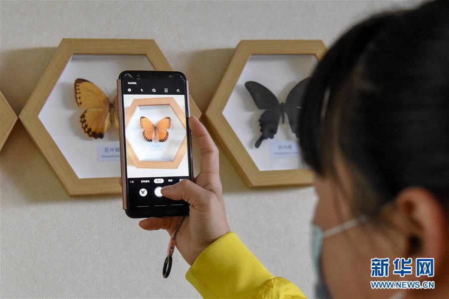 在吉木薩爾縣七彩蝶園,游客拍攝蝴蝶標(biāo)本(5月14日攝)。新華社記者丁磊攝